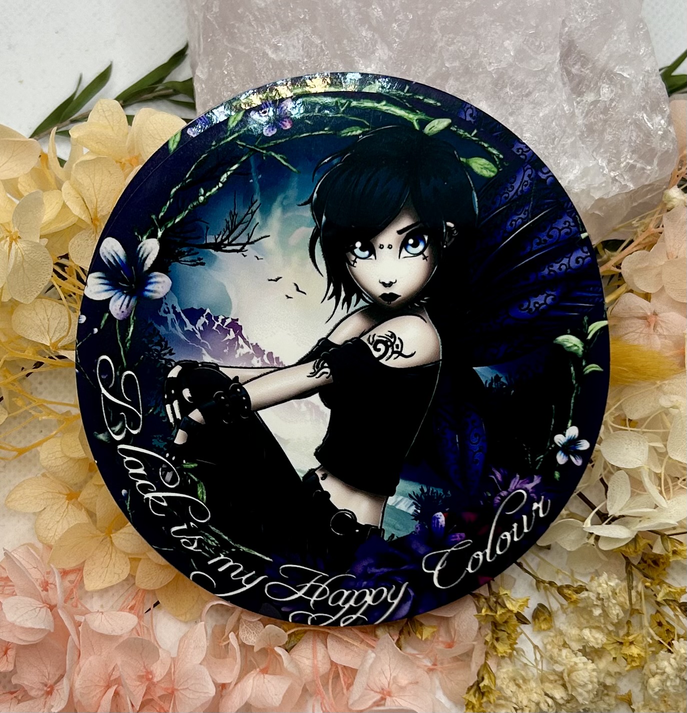 This is one of 4 designs available in the Hexxie Dark Fairy range, This one shows the gorgeous Paige with the words “Black is my happy colour”. This coaster measure’s approx 9.5cm diameter.