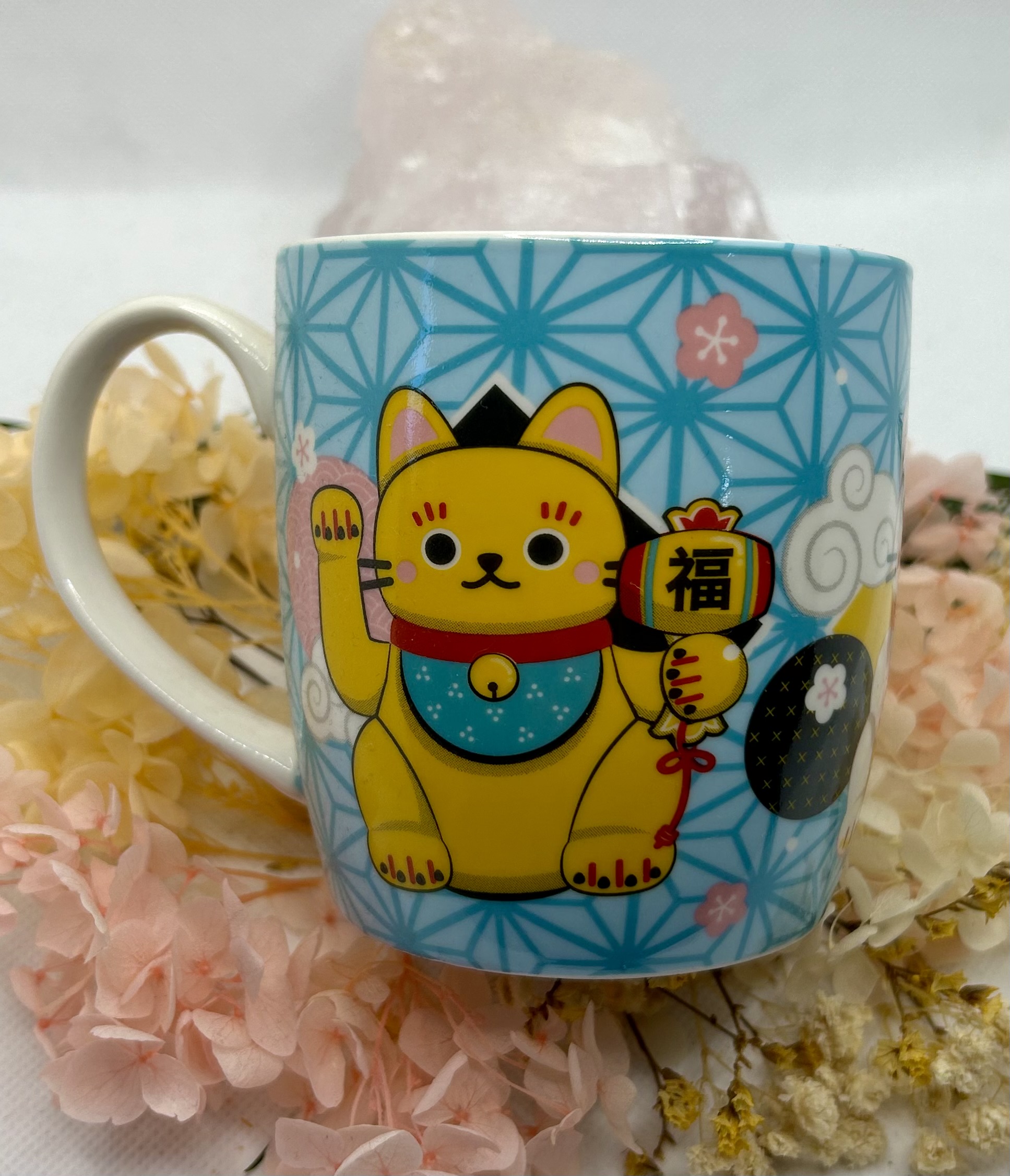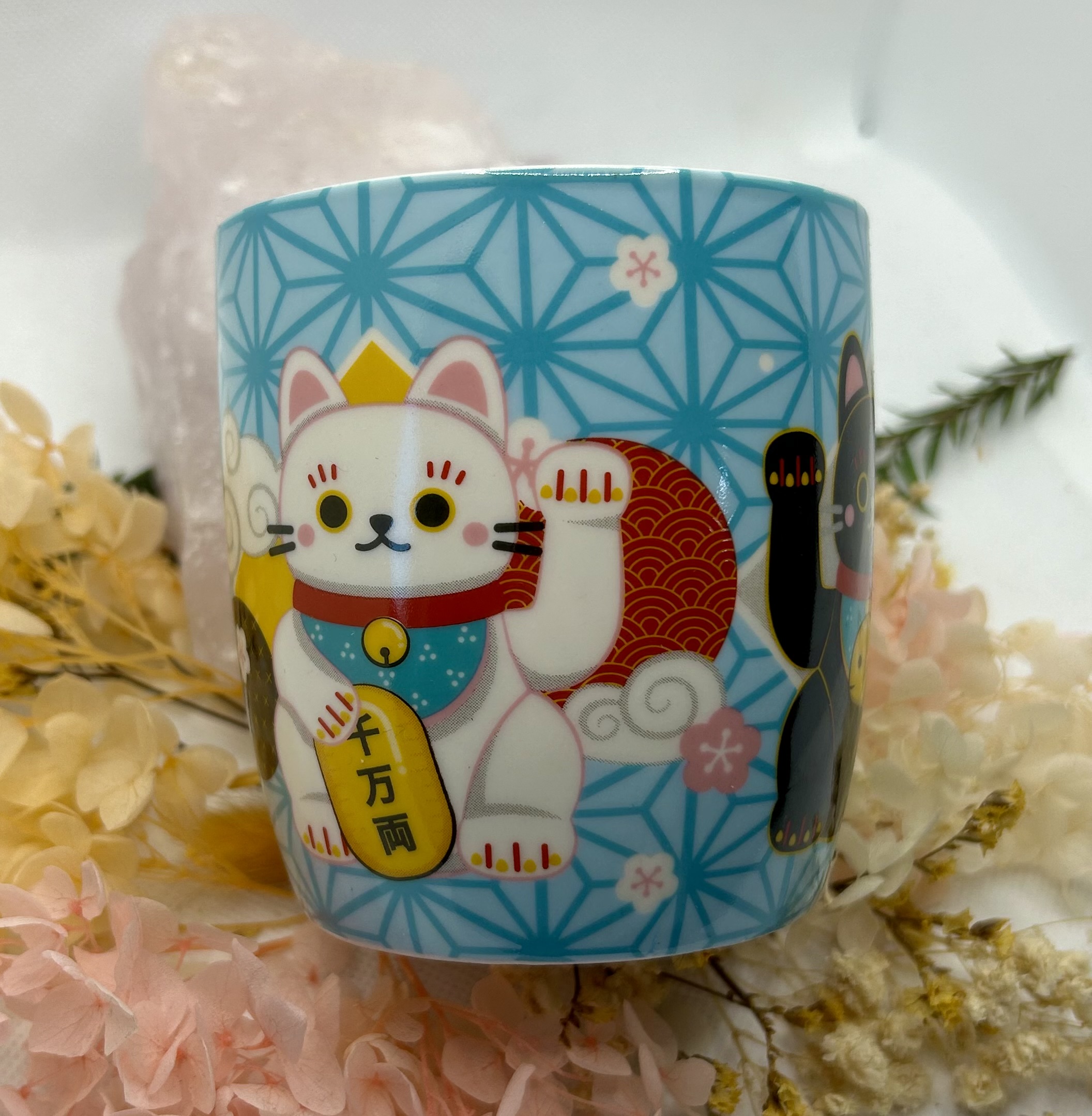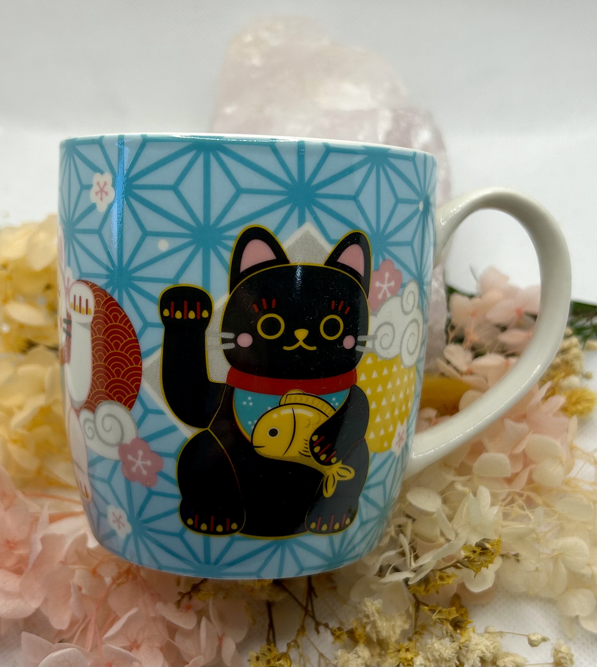 This lovely Lucky cat mug has 3 different Lucky Cats around the mug itself one black, one gold and one white. Capacity of the mug is 300ml and it is Dishwasher and Microwave safe.